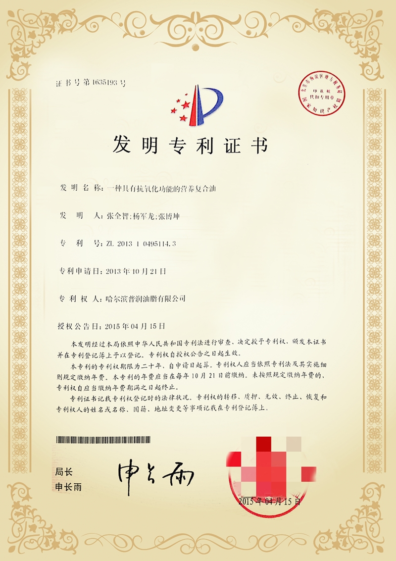 老年人營(yíng)養(yǎng)復(fù)合油專(zhuān)利證書(shū)