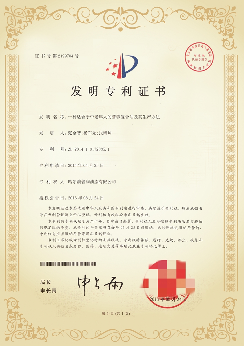 老年人營(yíng)養(yǎng)復(fù)合油專(zhuān)利證書(shū)